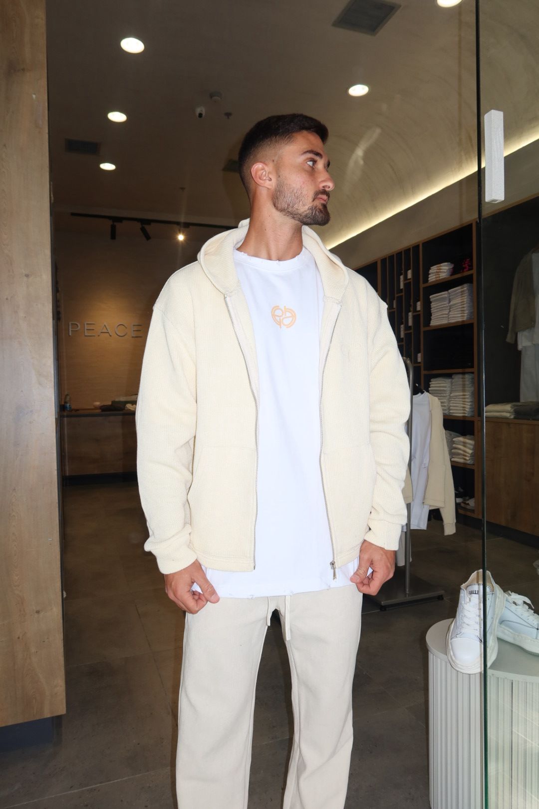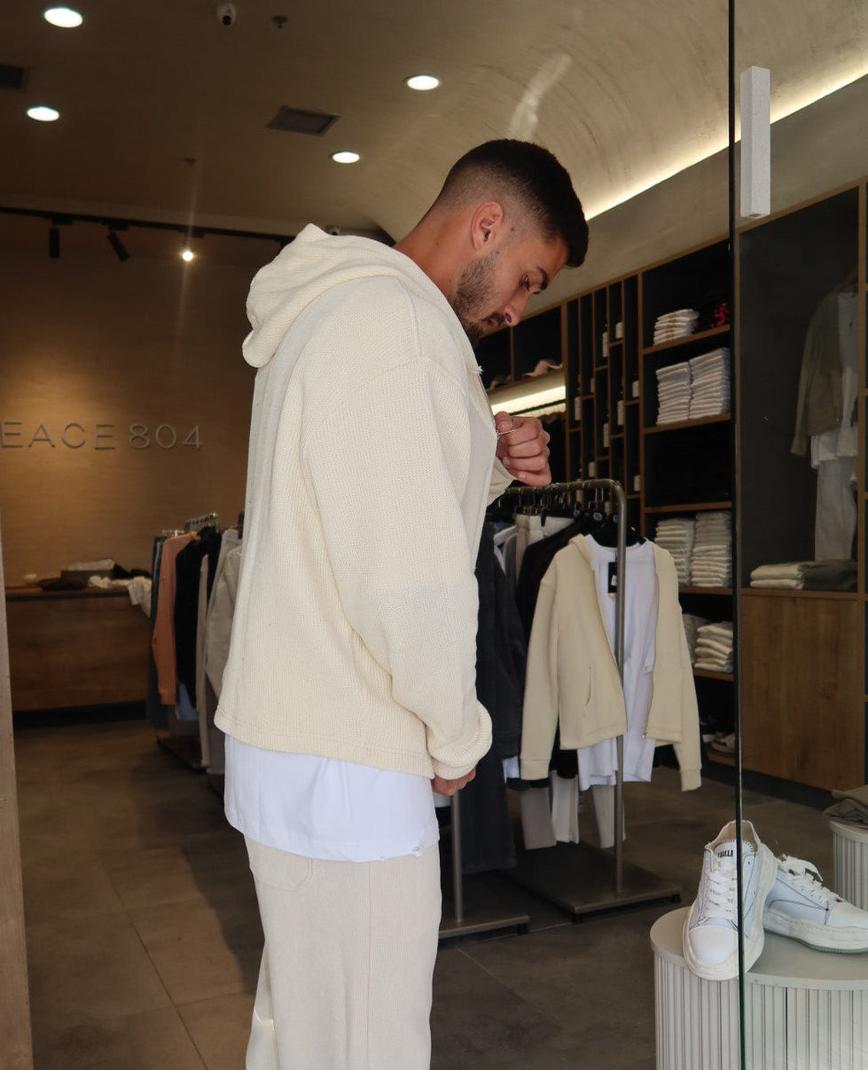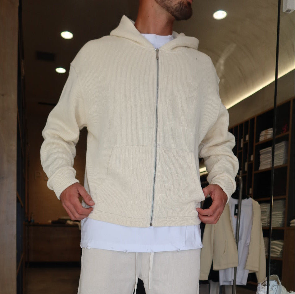 ג׳קט סריג בצבע שמנת בגזרה מעט אוברסייז, עם מראה נקי ועל-זמני שמתיישב בדיוק על הקו היוקרתי של PEACE804. הסריג רך, נעים ומרגיש כמו שכבה טבעית על הגוף, כזה שמוסיף סטייל בלי מאמץ. הרוכסן המלא מעניק אפשרות ללבוש פתוח או סגור, והכיסים הקדמיים נותנים טאצ׳ פרקטי שמשתלב בצורה אלגנטית עם העיצוב.